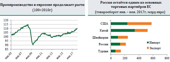 По итогам первых 11 месяцев 2017г Россия является четвертым основным торговым партнером ЕС. По сравнению с 2016 годом экспорт из ЕС в Россию вырос на 20,2% и составил €79,8 млрд, импорт - увеличился на 23,4% до €132 млрд. Таким образом, за январь-ноябрь 2017г взаимный товарооборот России и ЕС вырос на 22%гг до €211,8 млрд. При этом, импорт из России в ЕС за январь-октябрь сильнее всего увеличился в сырьевой отрасли - энергия - 28,5%гг, другие сырьевые ресурсы - 29,6%гг, а экспорт из ЕС в Россию - в промышленной отрасли - машины и оборудование -27,1%. Рост товарооборота России и ЕС в 2017г во многом объясняется увеличением цен на нефть и укреплением рубля. Скорее всего, в дальнейшем взаимная торговля продолжит расти на фоне экономического оживления в России и восстановления взаимного сотрудничества.